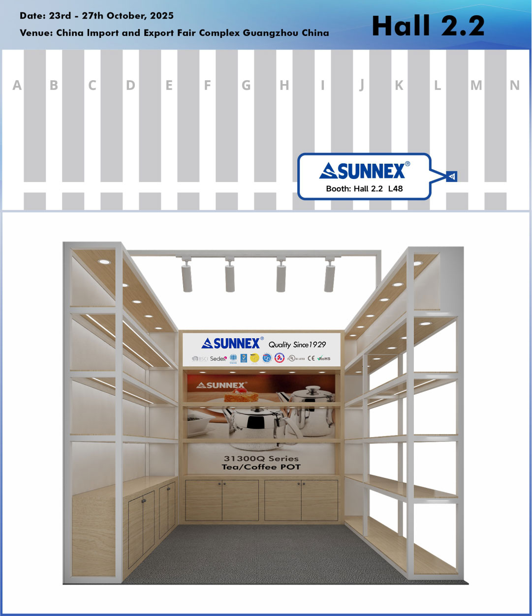 Guangzhou, Cina – ottobre 2025 – SUNNEX Century (Shenzhen) Ltd., produttore leader di articoli per buffet, scaldavivande, distributori di bevande e articoli per la casa di alta qualità, è lieto di invitare acquirenti internazionali, media e professionisti del settore a visitare i nostri stand alla 138a Fiera di importazione ed esportazione della Cina (Fiera di Canton).